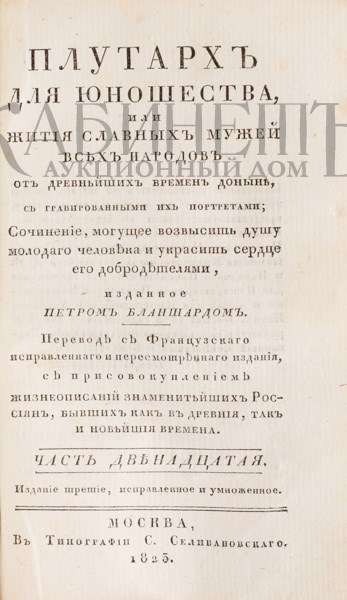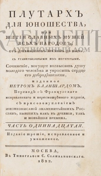 [Бланшар П.]. Плутарх для юношества, или Житие славных мужей всех народов, от древнейших времен до ныне, с гравированными их портретами. Изданное Петром Бланшаром, перевод с французского. Издание третье, исправленное и умноженное. Части XI и XII в одной книге [из 12-ти]. М., в типографии С. Селивановского, 1822.
