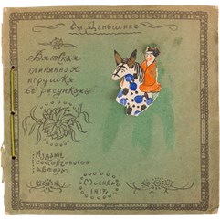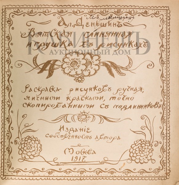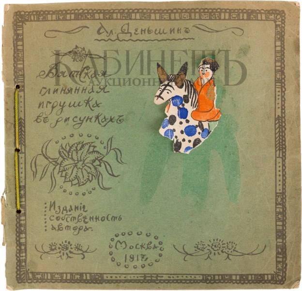 Деньшин А. Вятская глиняная игрушка в рисунках. Раскраска рисунков ручная, яичными красками, точно скопированными с подлинников. М., издание собственность автора, 1917.