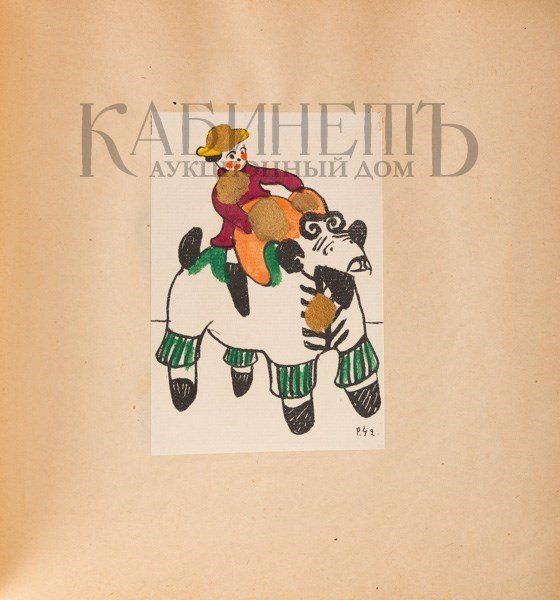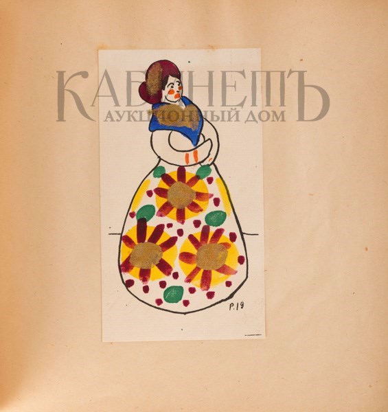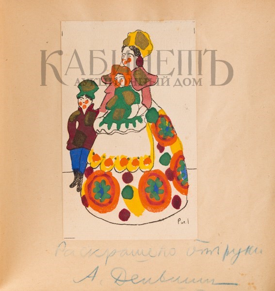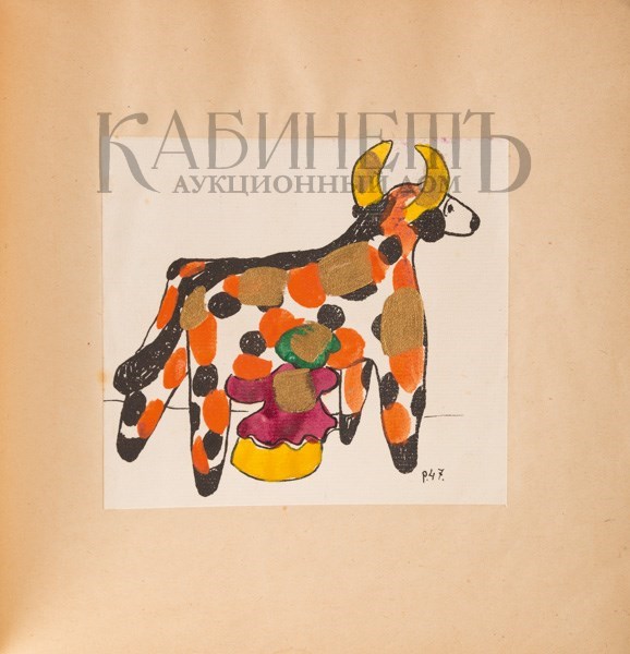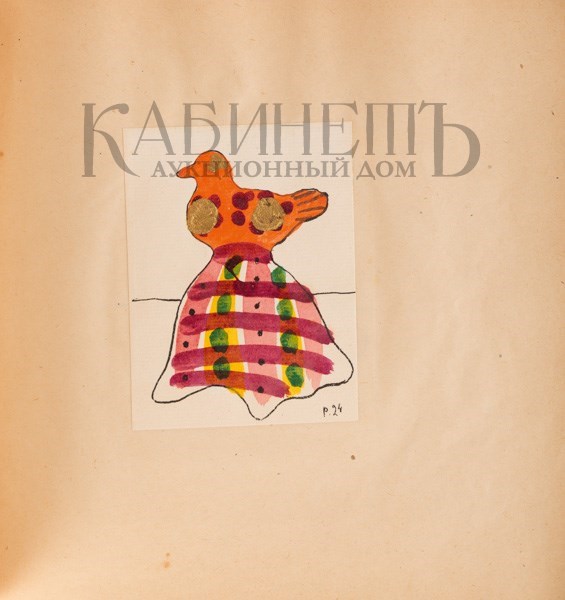 Уникальное авторское издание. В 1917 году Алексей Деньшин издал свою знаменитую и легендарную у русских библиофилов книжицу ручной раскраски о Вятской игрушке: 21 страница литографии золотом с рукописи автора; 50 листов с наклеенными иллюстрациями, раскрашенными акварелью автором. В цветной литографированной обложке по рисунку автора. На обложке наклеен раскрашенный акварелью рисунок А. Деньшина «Свистулька». Раскраска превосходного качества. Экземпляр на обычной бумаге, иллюстрации на «толстой» бумаге, под рисунком № 1 синим карандашом собственноручная роспись А. Деньшина. Книга имеет коллекционное и музейное значение!