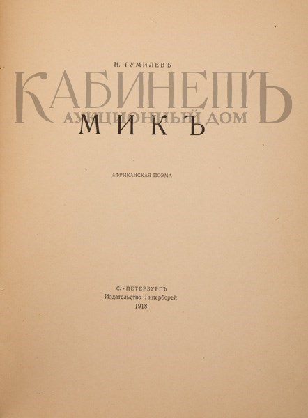 Гумилев Н. Микъ. Африканская поэма. СПб., издательство Гиперборей, 1918.