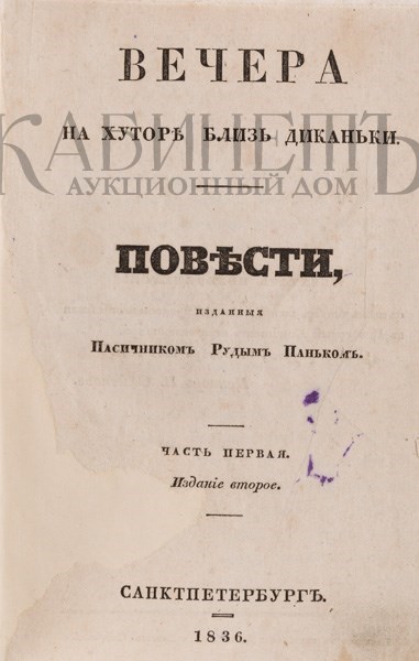 Гоголь Н.В. Вечера на хуторе близь Диканьки. Повести, изданные пасечником Рудым Паньком. Часть I. [из двух]. Издание второе. СПб., типография Департамента Внешней торговли,1836.
