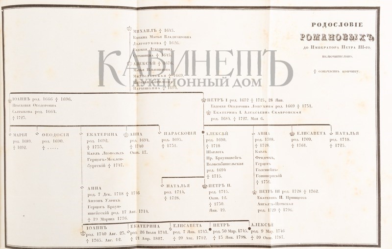 Таблица родословия Романовых до императора Петра III-го включительно на отдельном раскладном листе.
