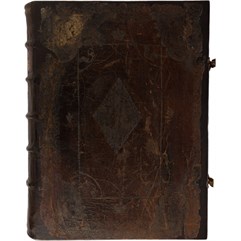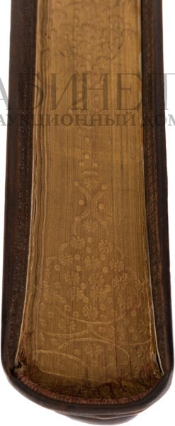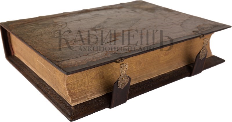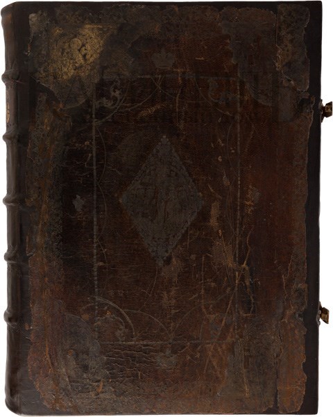 Экземпляр в реставрированном кожаном переплете с наклеенным фрагментом аутентичного кожаного переплета с золотым тиснением на верхней крышке. Обрез золоченый, с тиснением. Латунные застежки. Затеки от воды. Некоторые страницы реставрированы. На титульном листе штамповые экслибрисы.