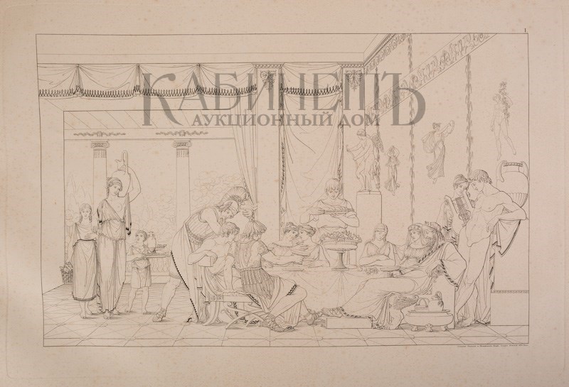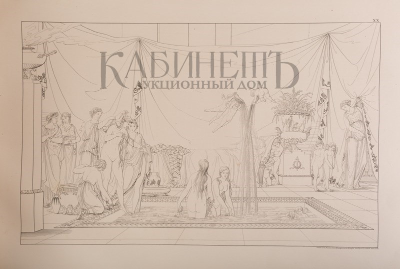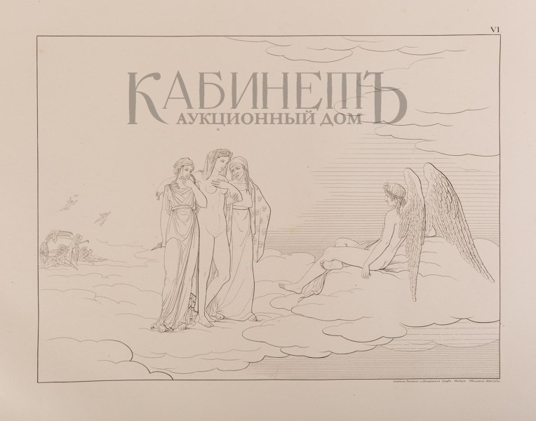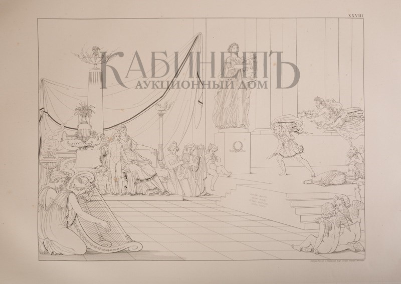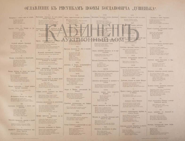 Гравированный заглавный лист и 62 листа гравюр, исполненных контуром. Фрагменты поэмы «Душенька» на русском языке, служащие пояснением к рисункам.