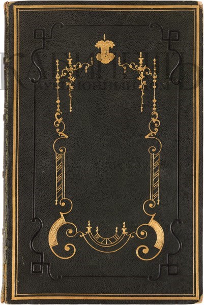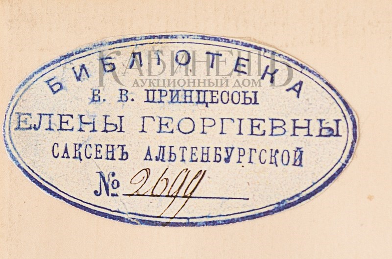 Экземпляр в старинном марокеновом переплете с золотым и блинтовым тиснением по крышкам и корешку. Тройной золотой обрез. Золототисненная подвертка, дублюра из муара. В очень хорошем состоянии. Потертости по корешку, незначительные «лисьи» пятна на боковом поле нескольких страниц. Экслибрис принцессы Елены Георгиевны Саксен-Альтенбургской на обороте свободного листа форзаца.