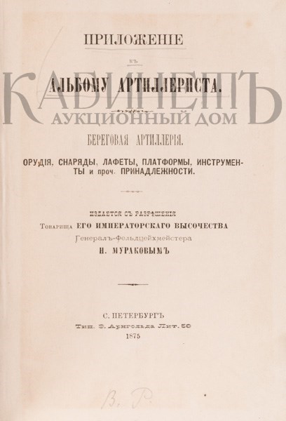 Архив аукциона №25(75) Лот 67 Приложение к альбому артиллериста. Береговая артиллерия. Орудия, снаряды, лафеты, платформы, инструменты и проч. Принадлежности. Издается с разрешения Товарища Его Императорского Высочества генерал-фельдцейхмейстера Н. Мураковым. СПб., Тип. Э. Арнгольда, 1875.