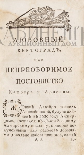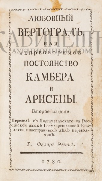 Эмин Ф. Любовный вертоград или непреоборимое постоянство Камбера и Арисены. Второе издание. Перевёл с Португальского на Российский язык Государственной Коллегии иностранных дел переводчик, г. Фёдор Эмин. [Б.м.],1780.
