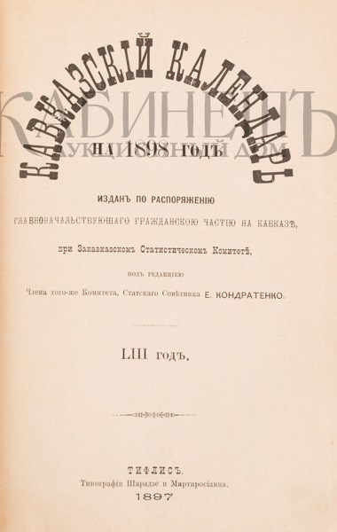 Кавказский календарь на 1898 год. Издан по распоряжению Главноначальствующего гражданскою частию на Кавказе. Тифлис, типография Шарадзе и Мартиросьянца, 1897.