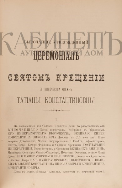 Высочайше утвержденный церемониал о святом крещении Ее Высочества Княжны Татьяны Константиновны. СПб., Типография Тренке и Фосно, [1890].