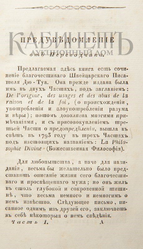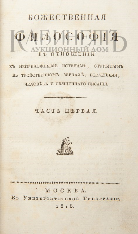 [Дютуа де Мабрини М.Ф.] Божественная философия в отношении к непреложным истинам, открытым в тройственном зерцале: Вселенной, Человека и Священного писания. Часть I, II [из 6-ти]. М., в Университетской типографии, 1818.