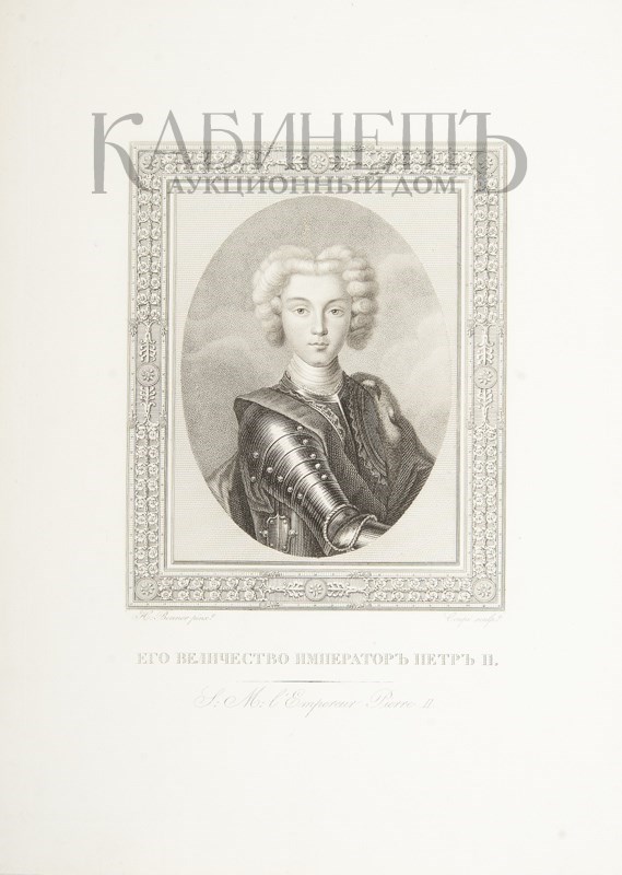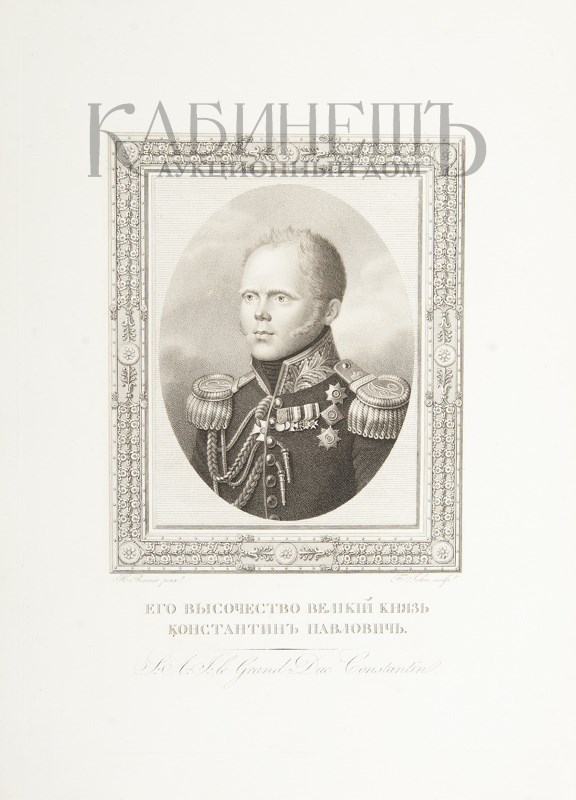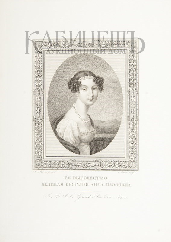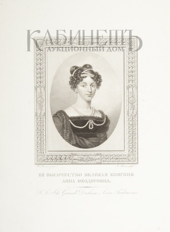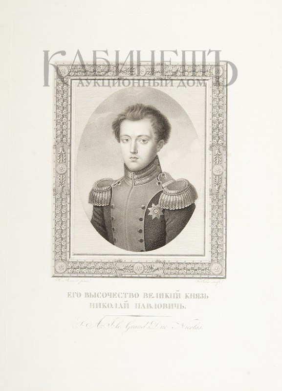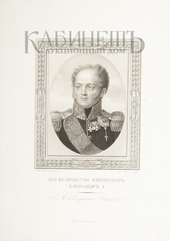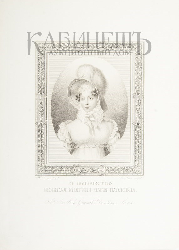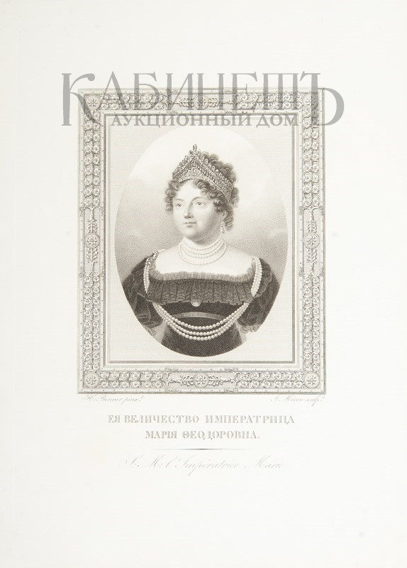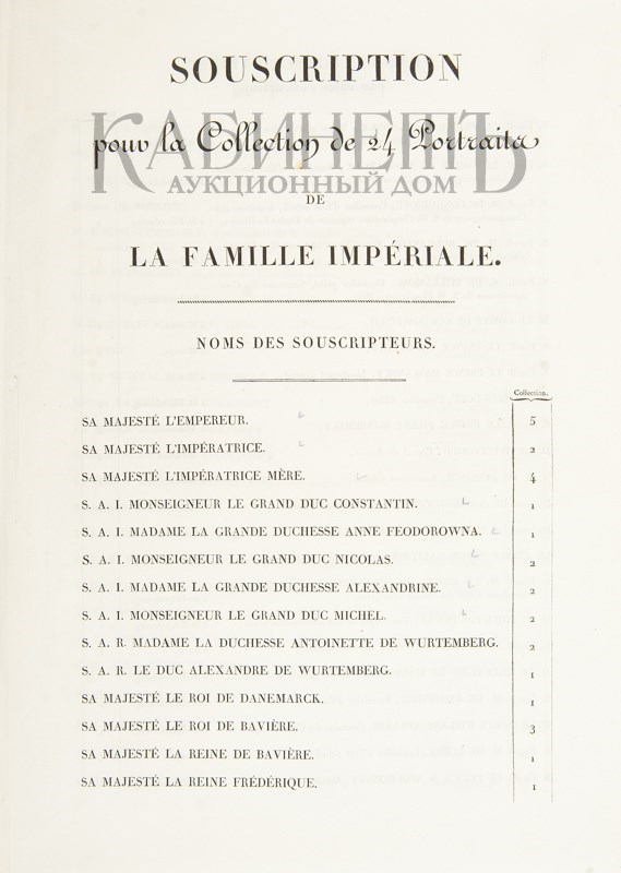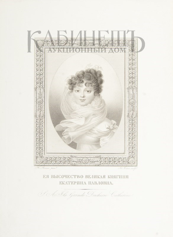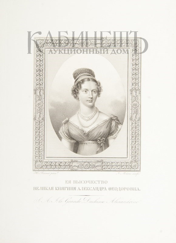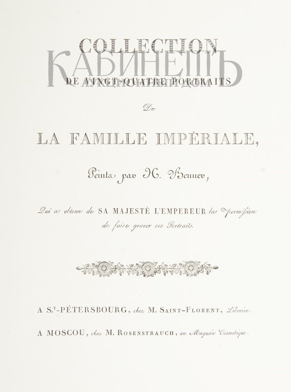 Собрание двадцати четырех портретов императорской фамилии, писанных живописцем Беннером, который получил от Его Императорского Величества позволение выгравировать сии портреты. В Санкт-Петербурге у книгопродавца М. Сент-Флорана. В Москве в Косметическом магазине Розенштрауха. Collection de vingt-quatre portraits de la famille imperiale, peintra par H. Benner, Lui a obtenu sa majeste l`Empereur la permission de faire graver ces Portraits. A S-Petersbourg, cher M. Saint-Florent, A Moscou, cher M. Rosenstrauch. [Париж, 1817].