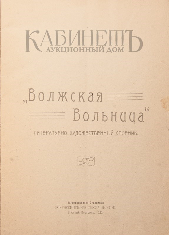 Волжская Вольница. Литературно-художественный сборник. Нижегородское отделение Всероссийского союза поэтов. Нижний - Новгород, [б.и.],1920.
