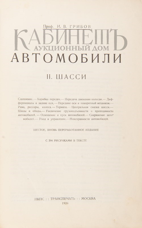 Грибов И.В. Автомобили. 2 часть. Шасси. М.-Л., НКПС, ТРАНСПЕЧАТЬ, 1926.