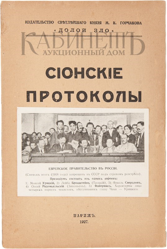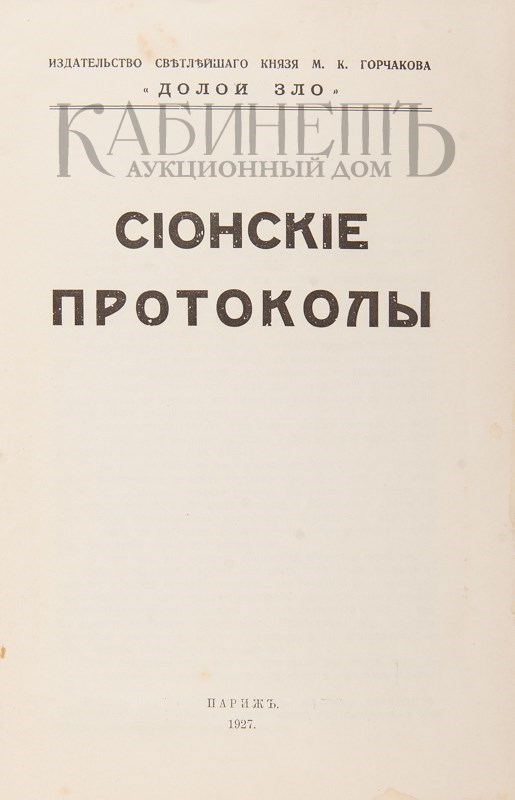 Сионские протоколы. Париж, издательство Светлейшего Князя М.К. Горчакова «Долой зло», 1927.