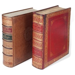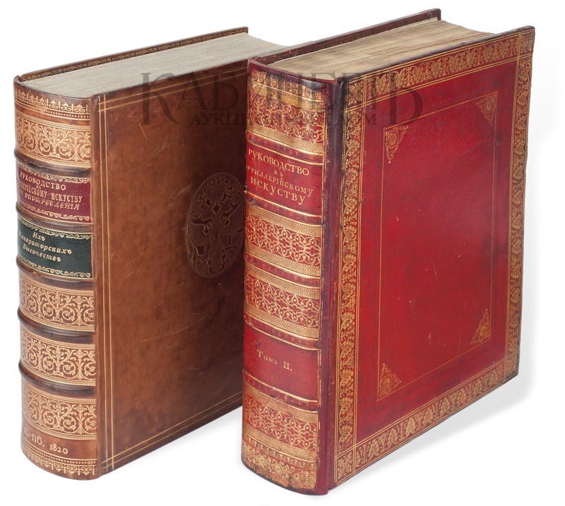 Комплект в разных переплетах: Том I – в современном цельнокожаном переплете. Тиснение золотом на верхней крышке (изображение герба Российской империи) и корешке. Форзацы из бумаги «под павлинье перо». Золототисненная подвертка. Крапленый обрез. Бинты. Ляссе. Следы от выведенных штампов и дореволюционный штамп на титуле, следы от чернил и следы от жучка на листе с посвящением. Редкие пометы карандашом. Том II – в старинном цельнокожаном переплете эпохи. Золотое тиснение по крышкам и корешкам. Золототисненная подвертка. Золотой обрез. Бинты. Следы от выведенных штампов на титуле, свободные листы форзаца и нахзаца деформированы от влажности, незначительные разводы от воды, многие страницы склеены по краю.
