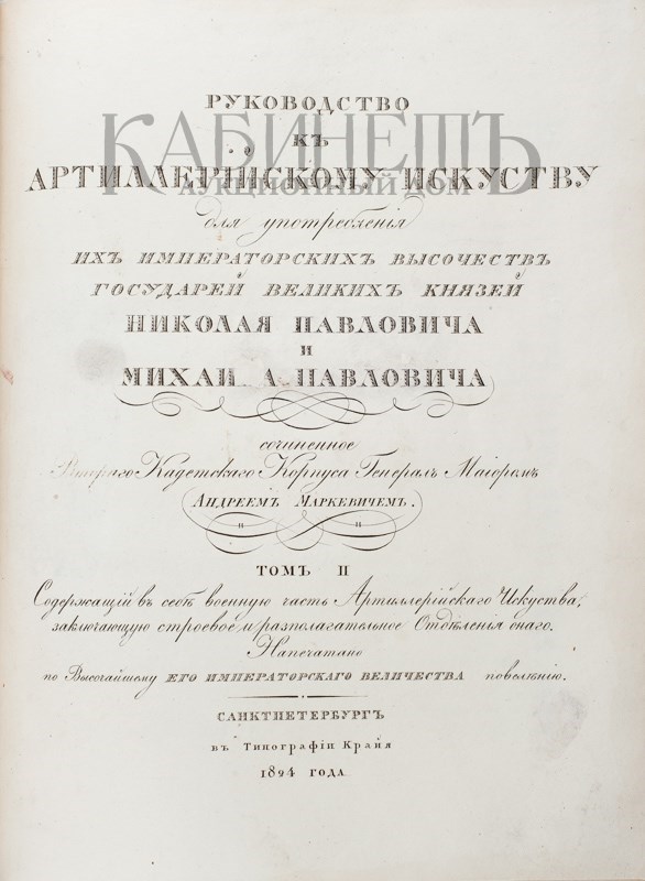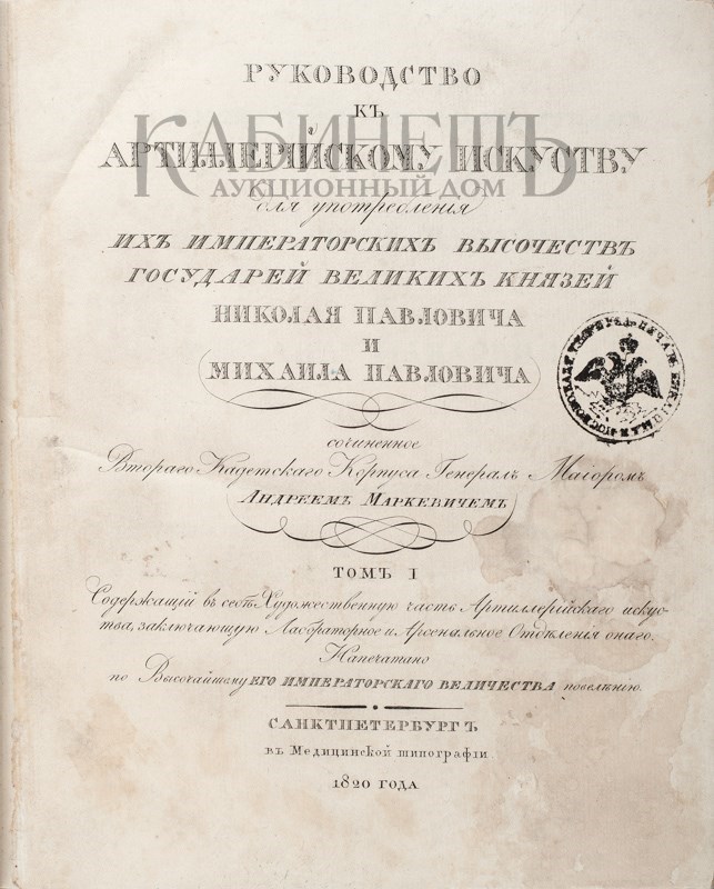 Маркевич Андрей Иванович (1771–1832) – генерал-лейтенант, техник-артиллерист, военный педагог. В 1810 году ему было поручено преподавать «артиллерийскую науку» великим князьям Николаю и Михаилу Павловичам. Настоящее издание являлось для артиллеристов того времени своего рода энциклопедией и долгое время служило единственным руководством по артиллерии на русском языке.