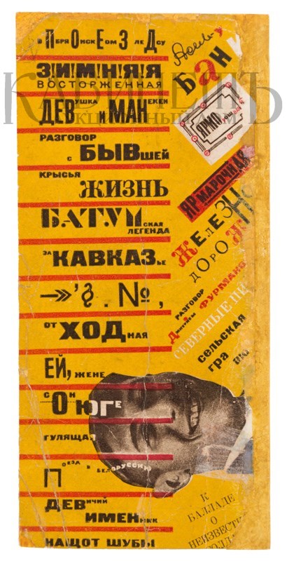 Экземпляр в бумажной издательской конструктивистской обложке, с фотомонтажами. Корешок восстановлен современной бумагой, края обложки и нескольких листов нарощены. Владельческая пометка на первом листе.