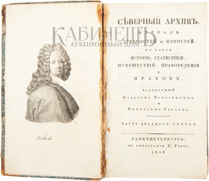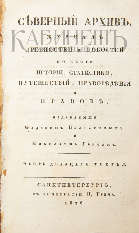 Северный архив. Журнал древностей и новостей по части истории, статистики, путешествий, правоведения и нравов, издаваемый Фаддеем Булгариным и Николаем Гречем. Часть XIII [Всего вышло 36 частей]. СПб., в типографии Н. Греча, 1826.