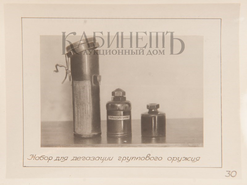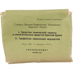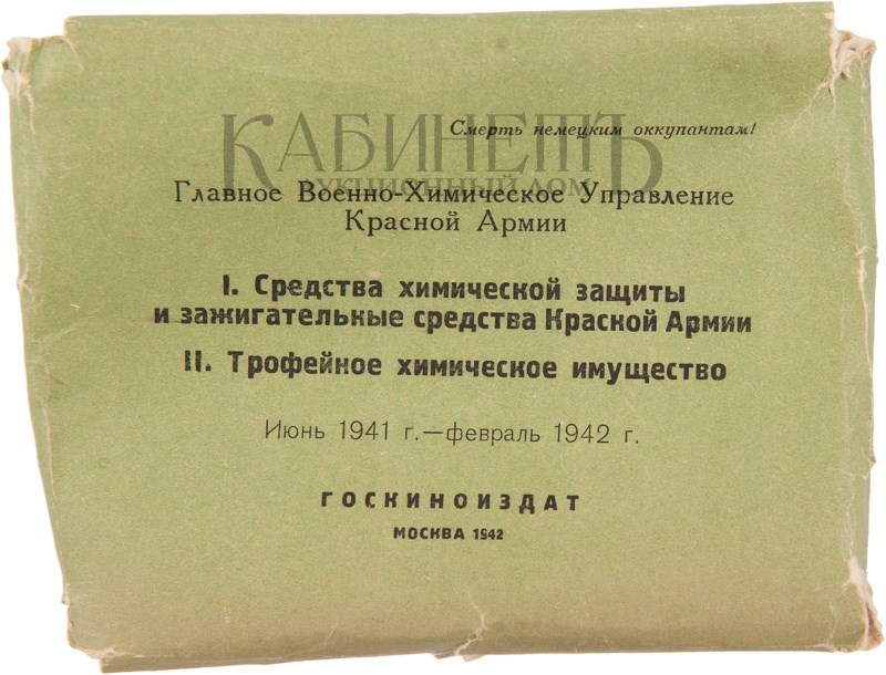 [Фотографическая серия]. Денисов. Средства химической защиты Красной Армии. Трофейное химическое имущество. Июнь 1941 – февраль 1942. М., Госкиноиздат, 1942.
