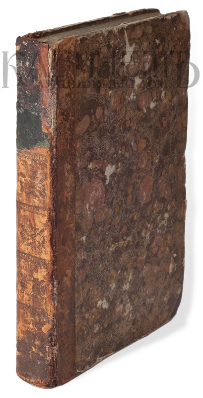 Экземпляр в старинном полукожаном переплете. Потертости, реставрация верхней части корешка, утраты в уголках верхней крышки, «лисьи» пятна, разводы от воды по нижнему уголку страниц. Букинистический штамп на нахзаце.