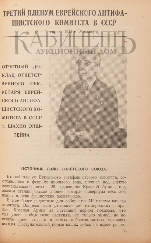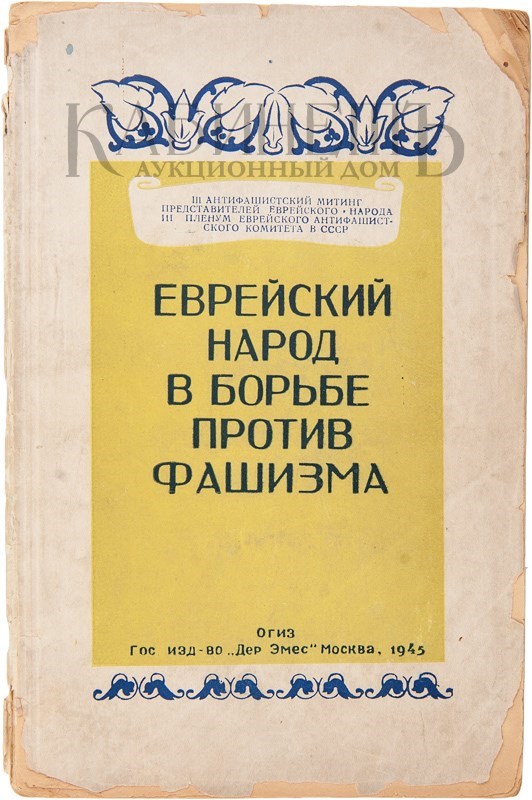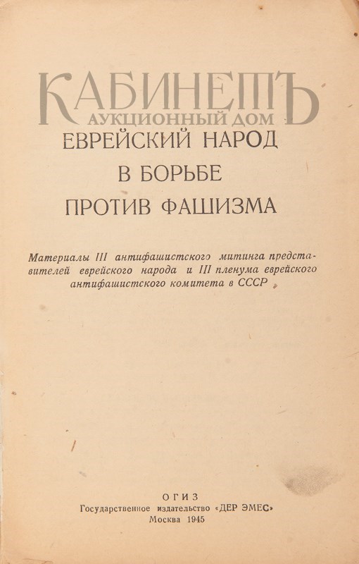 Архив аукциона №26(77) Лот 410 Еврейский народ в борьбе против фашизма. Материалы III антифашистского митинга представителей еврейского народа и III пленума еврейского антифашистского комитета в СССР. М., ОГИЗ Государственное издательство «Дер Эрмес», 1945.