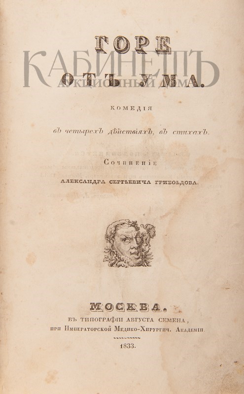 Первое русское издание «Горя от ума» вышло в Москве в 1833 году (впервые комедия была напечатана на немецком языке в Ревеле в 1831 году). Написанная в 1824 году комедия, как мы уже писали, частично была опубликована в булгаринском театральном альманахе «Русская талия» за 1825 год. Попытки полностью напечатать текст ее, предпринятые при жизни автора и в первые годы после его смерти, оказались безуспешными. В 1833 году цензура также не хотела выпустить комедию. Ее судьбу решила неожиданная резолюция Императора Николая I: «Печатать слово от слова, как играется, можно, для чего взять манускрипт из здешнего театра». Этим царь, по словам А.И. Герцена, попытался лишить комедию привлекательности запрещенного плода и противодействовать распространению ее в многочисленных списках. Текст комедии в издании 1833 года сильно сокращен и значительно изменен театральной цензурой. Так появилась на свет «театральная» редакция комедии. Впервые без цензурных купюр «Горе от ума» напечатали за границей в 1858 году и лишь в 1862 году — в России.