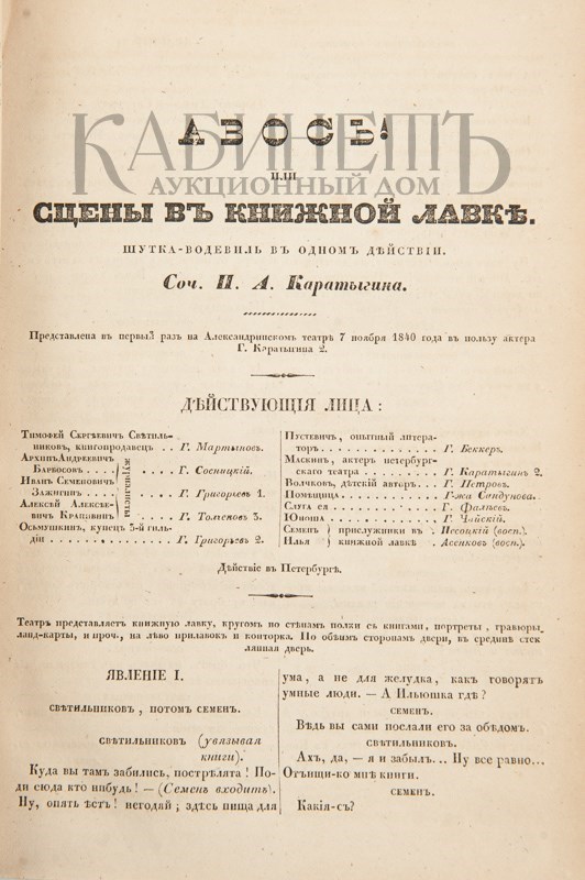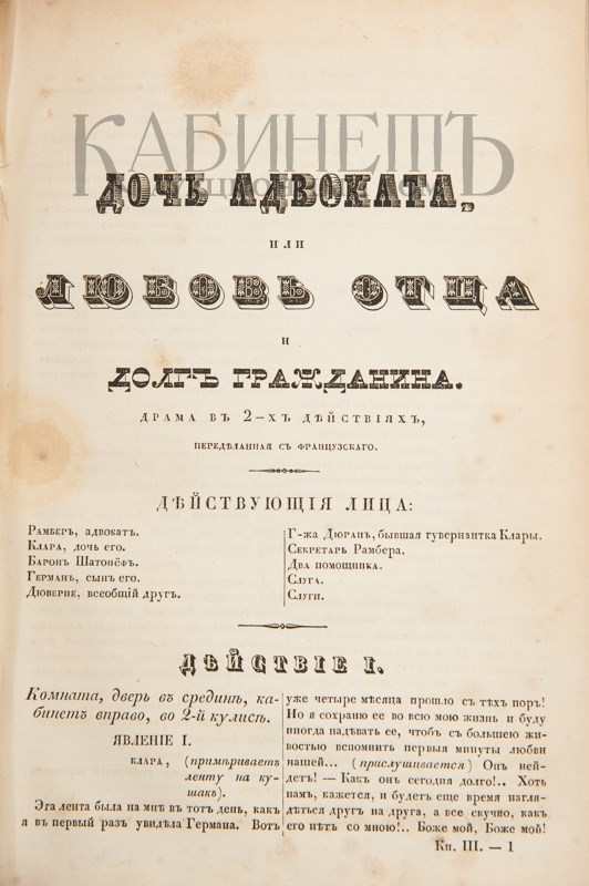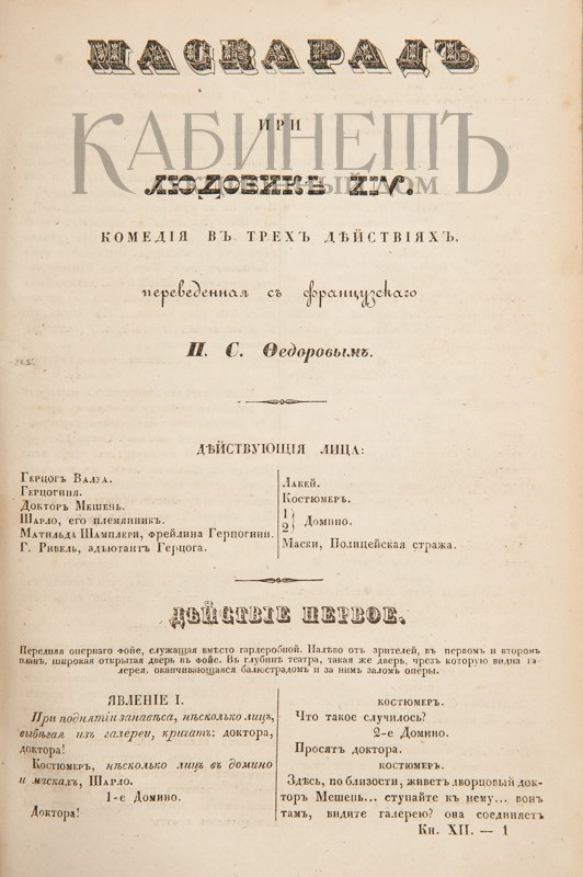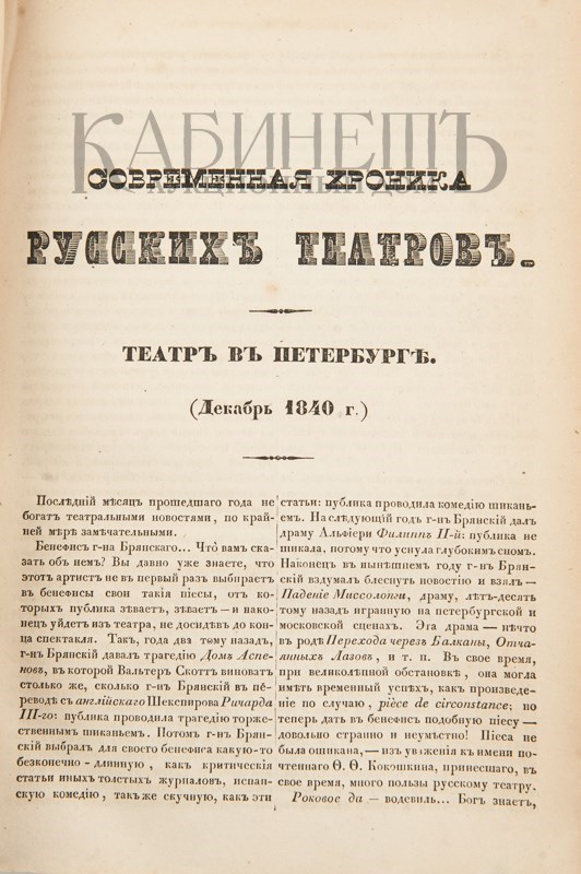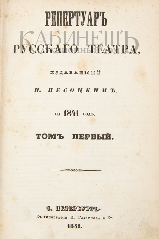Репертуар русского театра – ежемесячный театральный журнал – выходил в Петербурге в 1839–1841. Почти все место в журнале занимали переводные и оригинальные пьесы, игравшиеся на петербургской сцене (Ф.А. Кони, Д.Т. Ленского, П.А. Караты-гина, А.А. Шаховского, Н.А. Полевого и др.). Кроме пьес, печатались обозрения петербургской и московской театральной жизни, материалы о прошлом русского театра (Ф.В. Булгарина, А.А. Шаховского, Н.А. Полевого), небольшие музыкальные произведения, биографии и портреты известных актеров. Изредка появлялись обзоры репертуара провинциального театра. В 1840, а особенно в 1841 стали помещаться небольшие художественные произведения, преимущественно на темы театральной жизни, хроника культурной жизни и информация о зарубежном театре.