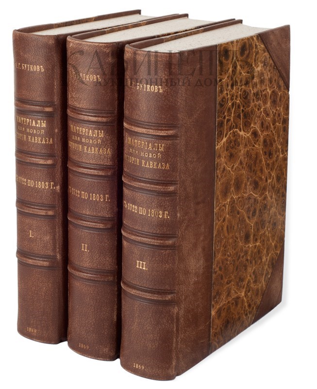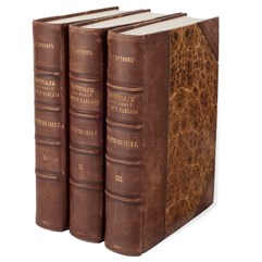 Экземпляр в современных полукожаных переплетах с золотым тиснением и бинтами по корешкам. В части I подклеен титульный лист, номер на титульном листе и обороте с. [3-4], разводы на части страниц. В части II полустертый дореволюционный штамп и пометки на титульном листе, «лисьи» пятна. В части III пятна на титульном листе и последней странице. В каждой части мытая с. 17, сведенные номера, возможно, печати. Владельческие пометы.