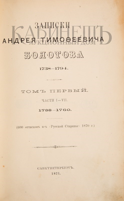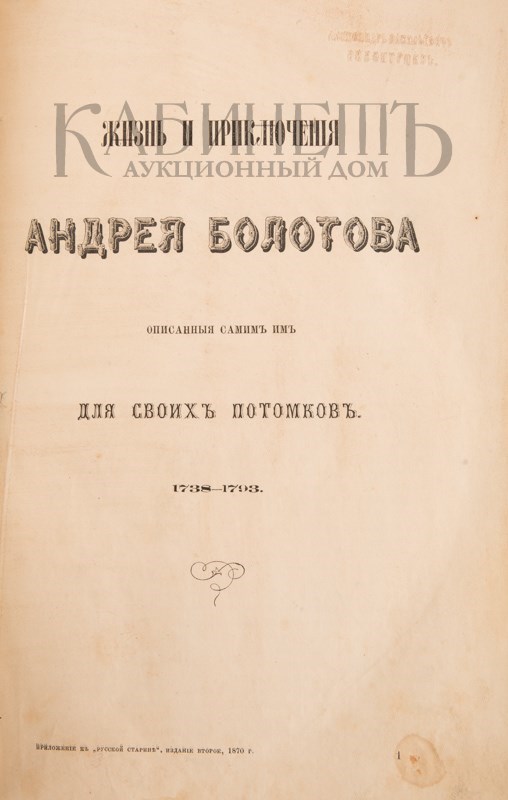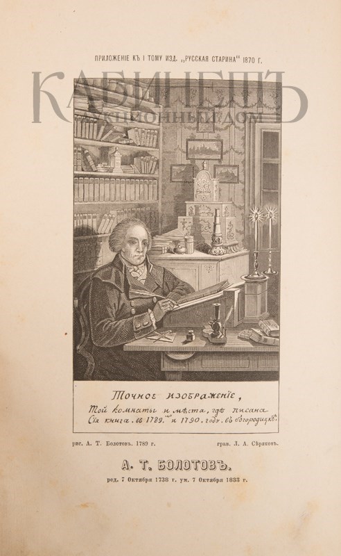 Болотов Андрей Тимофеевич (1738–1833) – русский писатель и ученый-энциклопедист, один из основателей русской агрономической науки. В своих «Записках», которые он писал около тридцати лет, он ярко изобразил внутренний быт русского общества за все XVIII столетие, начиная с 1738 года, и касающихся самых разных его сторон. Эти «Записки» – главнейший из материалов для истории русского быта; они дают любопытнейшие подробности о домашнем и общественном воспитании русских дворян, сведения об их провинциальной и столичной, домашней и общественной жизни, об их военной и домашней службе. Кроме того, «Записки» дают понятие о состоянии сельского хозяйства, русской литературы, науки и книжной торговли и довольно подробно говорят об участии России в войне с Фридрихом II и о войнах Екатерины с турками, поляками и шведами.
