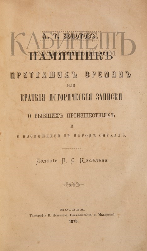 Болотов А.Т. Памятник претекших времен или краткие исторические записки о бывших происшествиях и о носившихся в народе слухах. М., Типография В. Исленьева, 1875.