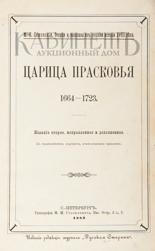 Семевский М.И. Очерки и рассказы из русской истории XVIII века. Царица Прасковья. 1664–1723. СПб., Издание редакции журнала «Русская старина», Типография М.М. Стасюлевича, 1883.