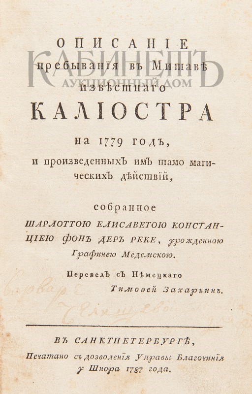 Описание пребывания в Митаве известного Калиостра на 1779 год, и произведённых им там магических действий, собранное Шарлоттою Елисаветою Констанцией фон дер Реке, урожденною Графинею Медемскою. Перевел с немецкого Тимофей Захарьин. СПб., Печатано с дозволения Управы Благочиния у Шнора, 1787.
