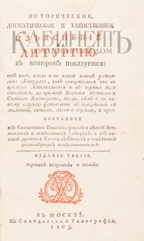 Архив аукциона №27(78) Лот 13 Дмитревский И.И. Историческое, догматическое и таинственное изъяснение на литургию, в котором показуется: от кого, когда и на какой конец уставлена литургия, как совершалась она во времена апостольские и в первые три столетия, до времен Василия Великого и Святого Златоуста, когда, кем и по какому случаю установлены в совершении ее молитвы, ектении, песни и обряды и проч. Собранное из Священного писания, правил и деяний Вселенских и Поместных соборов, и из писаний древних святых отцев и новейших достоверных повествователей. Издание третье, первых исправнее и полнее. М., в Синодальной Типографии, 1805.
