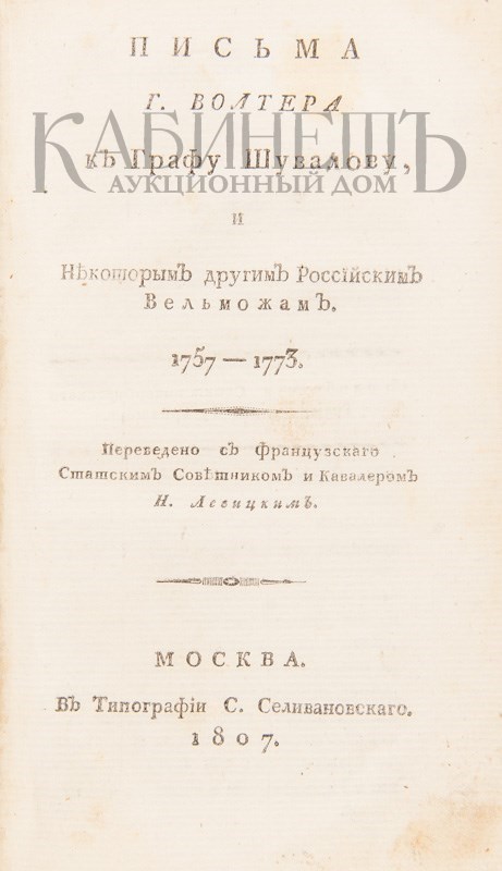 Письма г. Вольтера к графу Шувалову и некоторым другим Российским вельможам. 1757–1773. М., в типографии С. Селивановского, 1807.