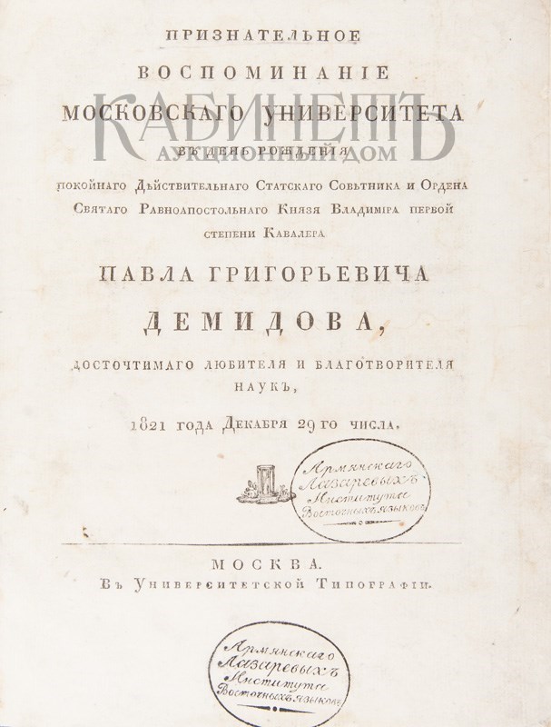 Экземпляр в старинном составном переплете. Потертости переплета, незначительные «лисьи» пятна, титульный лист немного загрязнен. Два штампа Армянского Лазаревых Института Восточных языков на титульном листе и дореволюционная печать библиотеки Лазаревского института восточных языков на с. 1.
