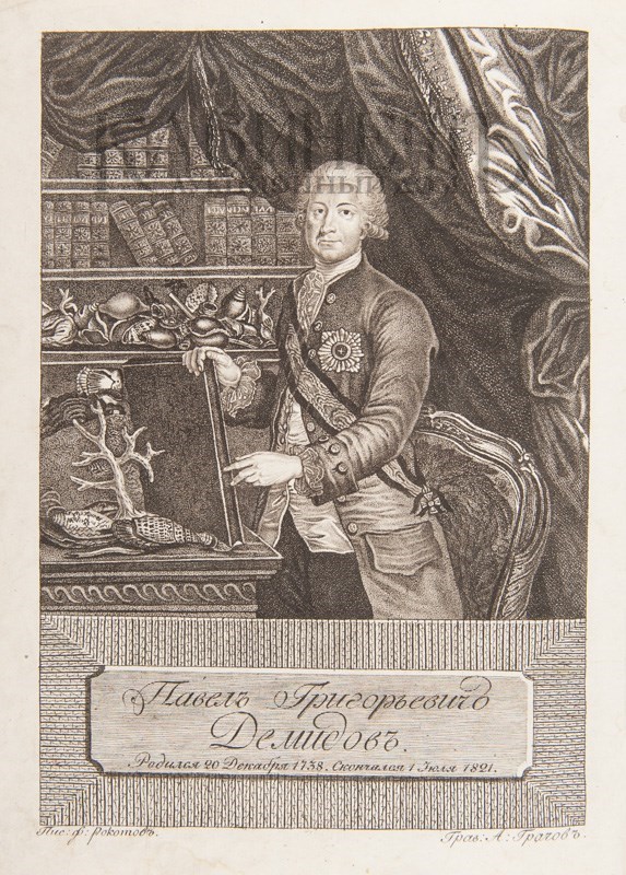 Гравированный фронтиспис – портрет Павла Григорьевича Демидова. Рис. Ф. Рокотов. Грав. А. Грачов.
