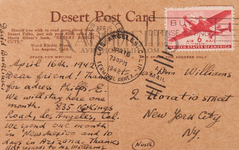 Текст письма: «April 16th. 1942. / Dear friend! Thanks / for adress Philips E. / We will stay here one / month. 835 [North] Kings / Road, Los Angeles, CA. / We spend one month / in New Mexico and 10 / days in Arizona. Thanks / Best regards to Mr Williams. / David Burliuk».