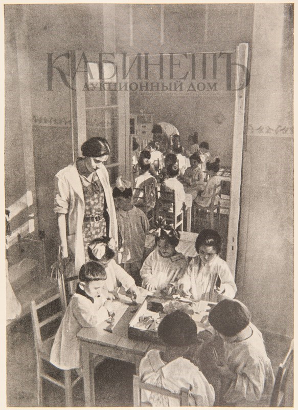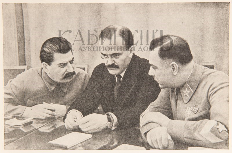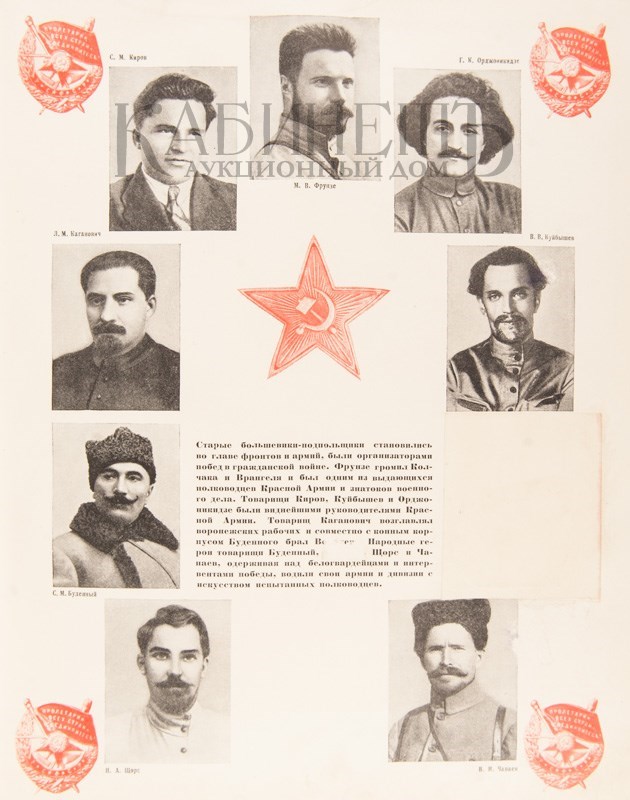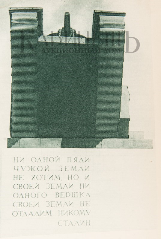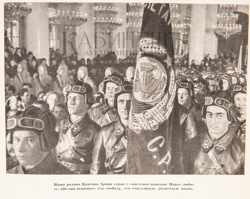Экземпляр в издательском коленкоровом переплете с тиснением красной краской по корешку и верхней крышке. иллюстрированные форзацы. Разводы от воды в верхнем поле первых листов, небольшой надрыв в нижнем поле последней страницы, два листа выпадают, портрет и имя врага народа на с. [35] заклеены бумагой, стершийся нечитабельный штампик на одной странице.