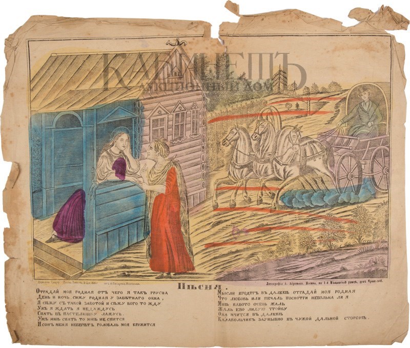Бумага, литография, раскраска акварелью, надрывчики и мелкие утраты по краям, загрязнения.
