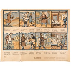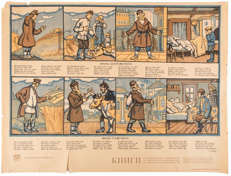 Плакат. Автор Радаков А. Жизнь безграмотного. Жизнь грамотного. Книги по огородничеству и скотоводству, по свиноводству, почвоведению и по вопросам хозяйства. Пг., Государственное издательство, 1920.