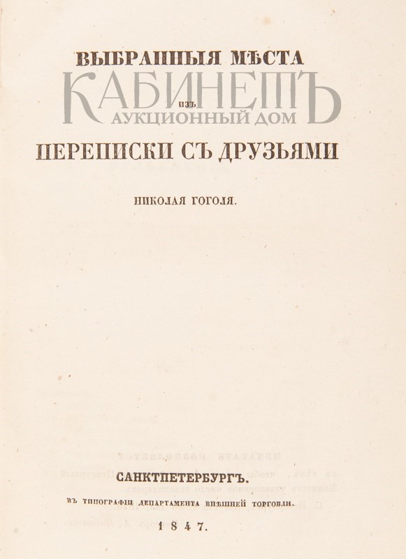 Смотри: Смирнов-Сокольский. №614: «Выбранные места» были встречены глубоким недоумением в кругах истинных почитателей Н. Гоголя и вызвали резкие возражения даже со стороны ближайших его друзей – С.Т. и К.С. Аксаковых». Лесман. №623. Ульянинский. №4148: «Первое издание. Ценится до 3 р.»