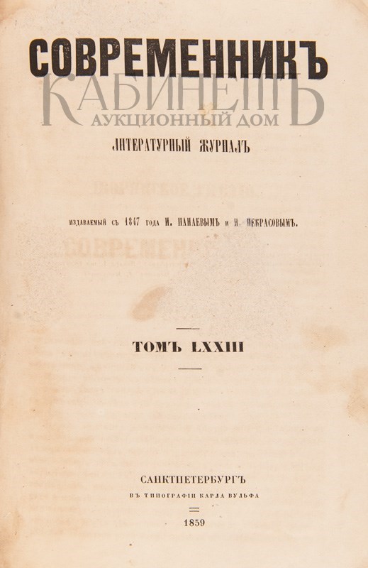 [Тургенев И.С. Дворянское гнездо]. Современник. Литературный журнал, издаваемый с 1847 года И. Панаевым и Н. Некрасовым. Том LXXIII. СПб., в типографии Карла Вульфа, 1859.