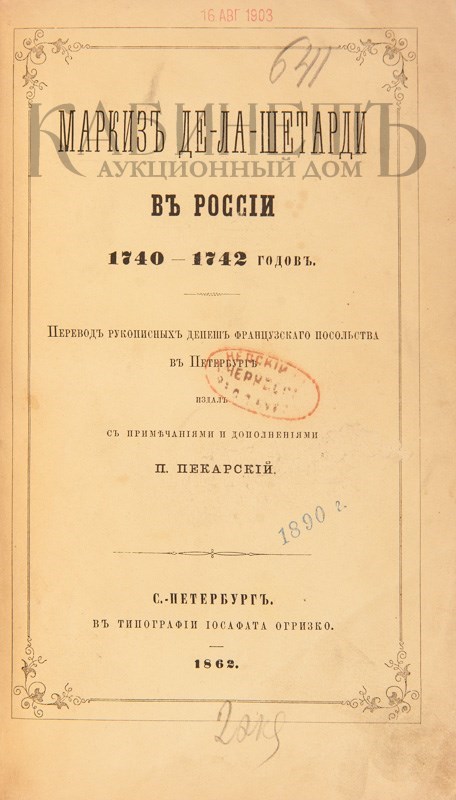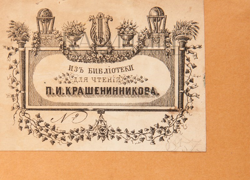 Экземпляр в современном полукожаном переплете с золототисненной наклейкой на корешке. Сохранена издательская шрифтовая обложка. Разводы от воды, пятна в начале и в конце блока, дореволюционные печати на обложке, титульном листе, с. I второго счета, с. 638. На форзаце экслибрис библиотеки П.И. Крашенникова.
