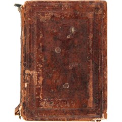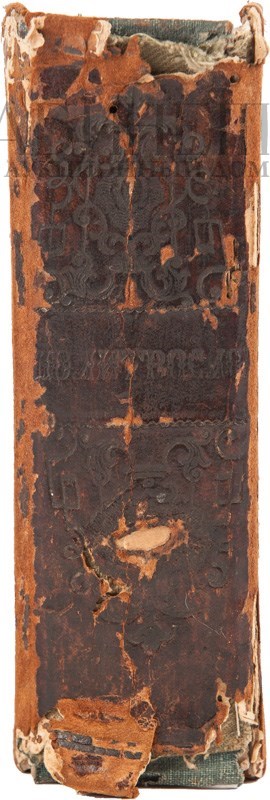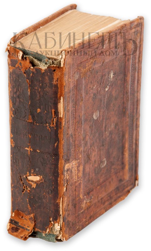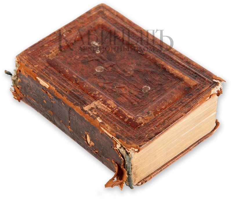 Экземпляр в старинном цельно-кожаном переплете с блинтовым тиснением по крышкам. Тройной золотой обрез. Потертости переплета, надрывы и утраты в нижней и верхней части корешка, следы жучка на первых страницах, временные пятна, л. 75-76 выпадают.