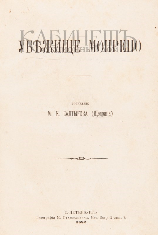 Салтыков-Щедрин М.Е. Убежище Монрепо. СПб., типография М. Стасюлевича, 1882.