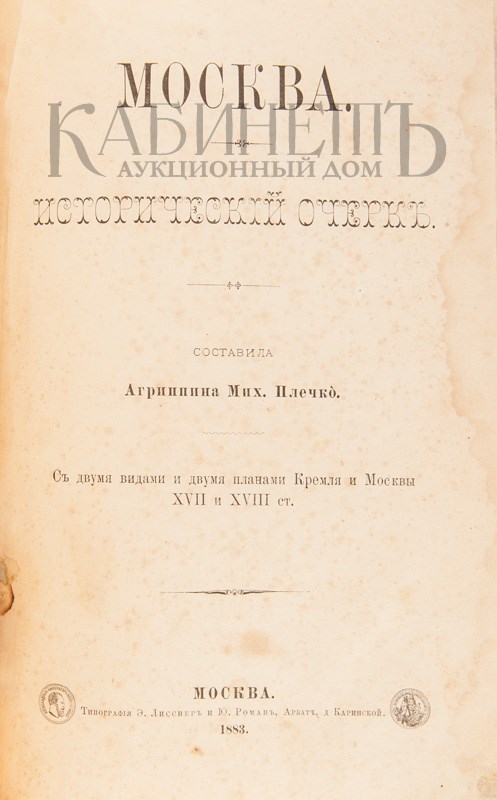 Плечко А.М. Москва. Исторический очерк. С двумя видами и двумя планами Кремля и Москвы XVII и XVIII ст. М., типография Э. Лисснер и Ю. Роман, 1883.