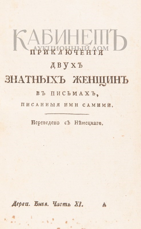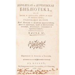 Городская и деревенская библиотека, или Забавы и удовольствие разума и сердца в праздное время, содержащия в себе как Истории и Повести нравоучительныя и забавныя, так и Приключения веселыя, печальныя, смешныя и удивительныя. Иждивением Н. Новикова и компании. Часть XI [из 12-ти частей]. М., в Университетской Типографии у Новикова, 1786.