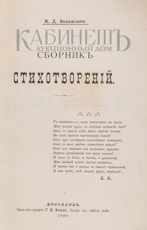 Прижизненное издание.Книга вышла мизерным тиражом, большая часть которого была уничтожена самим К. Бальмонтом, который переживал ее «неуспех», поэтому книга невероятно редка.