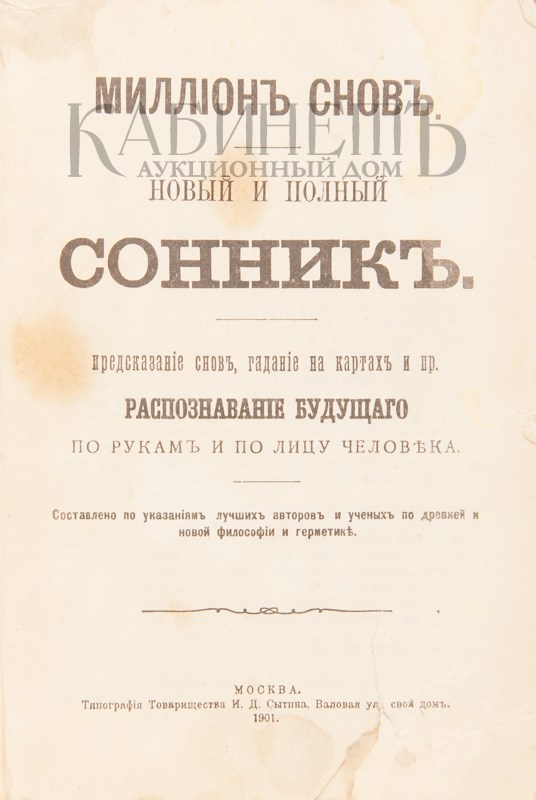 Архив аукциона №27(78) Лот 55 Миллион снов. Новый и полный сонник. Предсказание снов, гадание на картах и пр. Распознавание будущего по рукам и лицу человека. Составлено по указаниям лучших авторов и ученых по древней и новой философии и герметике. М., типография Т-ва И.Д. Сытина, 1901.
