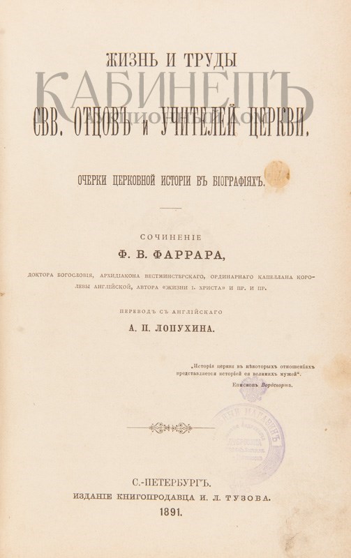 Фаррар Ф.В. Жизнь и труды Св. отцов и учителей церкви. Очерки церковной истории в биографиях. СПб., издание книгопродавца И.Л. Тузова, 1891.